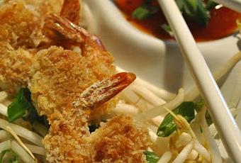 En tenant une crevette par la queue, la tremper dans l’oeuf battu et secouer pour vous débarrasser de l’excédent.Plonger la crevette dans la chapelure panko, en pressant légèrement pour bien l’enrober.Déposer sur une serviette propre. Répéter avec le reste des crevettes.