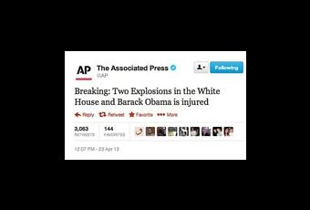 Le 23 avril, le compte Twitter de l’agence de presse américaine, Associated Press, affichait une alerte sur une attaque à la maison blanche : « Deux explosions, Obama blessé ». Le Tweet a eu le temps d’être diffusé 4700 fois sur le site de micro-blogging avant que l’agence ne suspende ses activités sur le site. Le compte principal de l’agence a été piraté par un groupe syrien partisan de Bachar El Assad. Dénommé « l’armée électronique syrienne », le groupe a revendiqué le piratage d’autres médias, comme BBC et CBS. L’AFP avait été piratée par ce même groupe en février dernier.