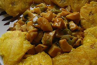Un plat délicieux accompagné de riz blanc cuit à la dominicaine ou de tostones comme ici.