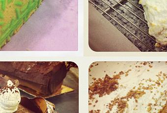 En haut à gauche, une bûche crème au beurre à la pistache avec des éclats de pistache.