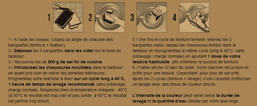 Une dizaine de coloris de teinture seront proposés : citron, rouge, navy, anis, fuchsia, bleu, orange, dune, rose et mouse. Le modèle "vierge" sera disponible du 36 au 41 au prix de 74€95. Les teintures seront quant à elles vendues 5 € l'unité.