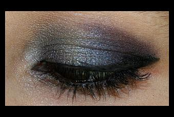 3) J'estompe au pinceau ou au doigt sur toute la paupière mobile: ça donne un gris et surtout ça va fixer le fard qui arrive.