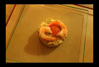Pour le dressage des assiettes, placez le cercle pâtissier au centre et le remplir au 2/3 de la préparation. Placez le pressoir sur le dessus et appuyez légèrement. Puis ajoutez les œufs de saumon et les crevettes cocktail pour la déco. Retirez délicatement le cercle. Et soyez fier de vous ! Quelques feuilles de menthe peuvent parfaire la présentation.