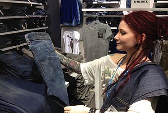 De loin, la môme ressemble à une version édulcorée de Lisbeth Salander. Tatouages, dreadlocks rouges, jean supertight, boots. De près on tombe sous le charme du sourire omniprésent, de l’œil qui pétille, de l’enthousiasme sans borne pour son job – qu’elle adore, et de son savoir totalement encyclopédique sur les jeans. Ne résistant pas à l’ouragan Rebecca, je suis reparti avec deux paires Diesel, et une interview pour vous toutes et tous pour tout savoir sur le Jean. On attache sa ceinture, on ouvre les esgourdes et on écoute la bonne parole de la prêtresse Rebecca (pas la femme d’Isaac, mais la déesse du jean – vous suivez ?). Je vous le mets sous forme de ‘F.A.Q.’.