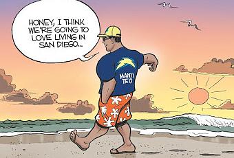Parlant au 11e rang, San Diego avait bon espoir de mettre la main sur un des 5 meilleurs joueurs de ligne offensive disponibles à l’encan pour remédier à leur principale faiblesse, mais il a fallu passer au plan B qui consistait en fait à s’assurer les services du 6e meilleur O-Lineman du repêchage, DJ Fluker d’Alabama. Il s’agit là d’un très bon prix de consolation qui aura un rôle important pour protéger Philip Rivers. Puis, ils se sont avancés en 2e ronde pour soulager tous les amateurs de football échoeurés d’entendre les commentateurs digresser sur Manti Te’o aux 2 minutes en sélectionnant le secondeur controversé. Personne ne niera le talent du produit de l’université Notre Dame, mais je n’aime pas cette sélection. Premièrement, l’équipe avait des faiblesses plus criantes et surtout, Te’o arrive avec du bagage. La talent est indéniablement là, mais ça prendra au natif d’Hawaii une force mentale extraordinaire pour s’extirper de cette foutue arnaque de fausse blonde. « NFL will eat you alive » a résumé un entraîneur cette semaine en parlant alors simplement de la pression de performer au plus haut niveau. Que ce soit pour gagner le respect des coéquipiers, de ses adversaires, des partisans et des omniprésents médias, Te’o aura toute une côte à remonter et si on se fie à ses performances au Combine et lors du match de championnat de la NCAA, c’est bien mal parti. Je suis beaucoup plus favorable au WR Keenan Allen, cueillit au 3e tour alors que les Mocks Draft de mars le plaçaient en fin de première ronde.