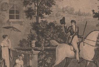 période ; l'impression étant semble-t-il postérieure. Les femmes sont encore habillées avec une robe à l'antique. L'une porte un châle. Le jeune garçon est en jockey ; ce qui est très chic.