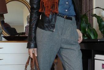 Je porte :Chemise en jeans, chapeau, écharpe (old) et ceinture H&M, perfecto Oakwook, pantalon Freesoul, chaussures André.