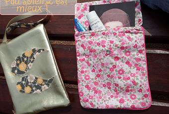 Pour cette dernière j’ai changé l’orientation de la pochette (qui s’ouvre par une pression par le « petit côté »). J’ai de nouveau utilisé un coupon de cuir, argenté ici, associé à un passe-poil rose fluo et un joli tissu rose fleuri. (Et une couche de molleton thermocollant pour donner de l’allure et de la tenue.)