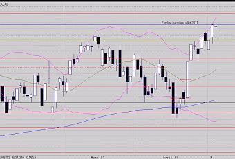 Il est donc fort probable que nous assistons à la formation de quelques bougies hésitantes, d'assez petites tailles, au cours des prochaines séances en ayant pour support celui des 3875 points. Dans tous les cas, cet harami ne devrait pas retarder trop le franchissement des 3913 points; il faudrait rechuter sous les 3795 points pour reconsidérer le scénario haussier en cours.