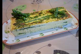 Dans un moule à cake beurré, disposer les asperges et verser l'appareil dessus.