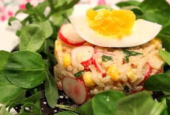Tassez et retirez le cercle. Répartissez un peu de salade verte tout autour de la salade de riz et déposez au-dessus un quartier d'oeuf.