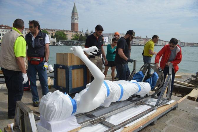 Objet de polémiques depuis sa mise en place à la Punta della Dogana, la statue moderne du sculpteur Charles Ray a été enlevée et sera remplacée par un traditionnel réverbère vénitien en fonte. Partisans et détracteurs de cette statue se sont affrontés depuis dès années sur le bien fondé d'avoir mis cette statue (d'une collection privée) dans un endroit public avec les contraintes afférentes : présence quasi permanente d'un vigile, statue couverte d'un caisson en plexiglas la nuit,... Malgré la qualité de l'oeuvre, j'éprouve un certain plaisir à penser que je pourrai retourner le soir m'asseoir sur ce môle et contempler Venise sous la lumière blafarde d'un vieux réverbère vénitien du XIXe siècle, sans doute l'oeuvre de la fonderie Hasselqvist, fondée en 1851 (en restauration depuis 2012)