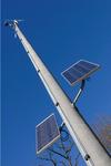 Le mât autonome fonctionne avec les énergies solaire et éolienne. La borne de vidéosurveillance est équipée d'une éolienne à trois pales, qui génère une puissance de 600 W - 24 V, et de deux panneaux solaires de 100 W - 12 V.