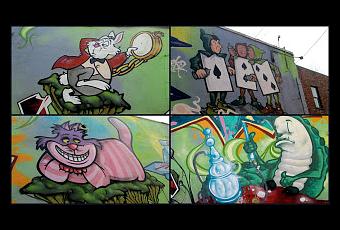 Détails d'une murale de ruelle, clairement inspirée d'Alice au pays des merveilles, que j'ai remarqué par hasard, alors que je cherchais une vieille enseigne peinte sur un immeuble rue De la Roche.