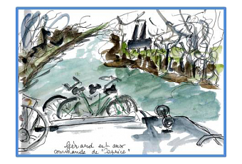 Un peu de bulle. Bernadette part avec son attirail de peinture pour chercher un endroit qui l’inspire. Gérard repart avec son vélo.