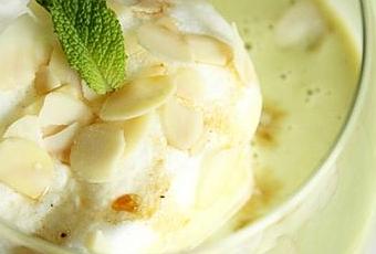 - Verser 1 louche de crème à l'avocat dans un bol ou une coupe. Placer un ou deux morceaux de blancs en neige. Parsemer par dessus d'amandes grillées et de caramel.