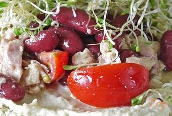 Etaler du houmous sur une face, déposer 2 à 3 cuillères de salade, puis, par-dessus, un peu d’alfalfa germé et refermer la pita. C’est prêt !