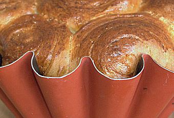 Après cette attente, badigeonner la brioche avec un jaune d'oeuf dilué dans un peu de lait et parsemer la surface de grains de sucre.