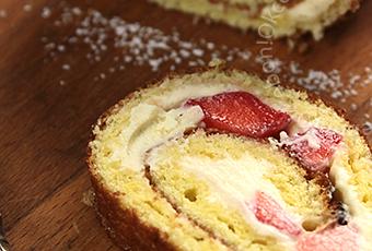 Une fois refroidie, dérouler la génoise, napper de crème de mascapone, parsemer de fraises et rouler de nouveau et poser sur un plat de service (conserver au frais avant de servir)