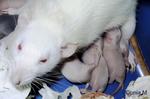 Hedwige allaitant ses ratons. Celui qui subit la patte de son frère c’est mon Orson Welles. A sa droite, le siamois de Madeleine.