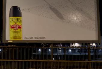 Qui y a-t-il de mieux pour convaincre de l’efficacité d’un produit ? Le prouver bien sûr. Orphea une marque d’insecticide a expérimenté en live à Milan (Italie) le produit à grande échelle. Son agence de communication Publicis a appliqué une colle anti-moustique transparente sur un panneau géant en lui donnant la forme d’un spray.