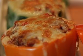 3)Dans un plat allant au four, verser le reste de la sauce et y déposer les poivrons remplis du mélange de boeuf. Faire cuire au four 350 F. 40 minutes ou jusqu'à ce que les poivrons soient mi-tendres. Si vous désirer les gratiner, le faire au bout de 35 minutes et pas laisser plus que 5 minutes si non les poivrons deviendront trop mous.
