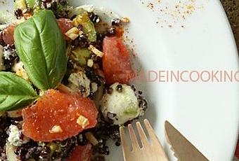 - Dans un saladier, mélanger le riz et les lamelles d'oignon. Puis ajouter les boules de mozzarella.