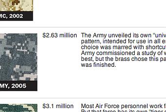 Le Washington Post a mis en ligne un tableau récapitulatif des différents motifs utilisés par l'armée américaine, pour ses uniformes, depuis 2002. Ils nous donnent aussi le coût de développement investi pour arriver à ses différents motifs. Punaise, ça coûte bonbon. À lire ici