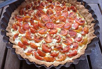 Etalez sur la pâte brisée crue le mélange fromage/basilic et recouvrez la totalité de la surface avec les tomates cerises.