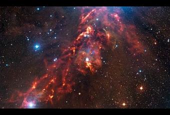 Cette nouvelle image spectaculaire ne montre qu'une partie d'un complexe plus important appelé le nuage moléculaire d'Orion, dans la constellation d'Orion (le chasseur). Composée d'un riche mélange de nébuleuses lumineuses, de jeunes et chaudes étoiles et de nuages de poussière froide, cette région s'étend sur des centaines d'années-lumière et se trouve à environ 1350 années-lumière de la Terre. Le rayonnement dans les longueurs d'onde submillimétriques dû aux nuages froids de poussière est vu en orange sur cette image et est superposé à une image de cette région prise dans le visible.