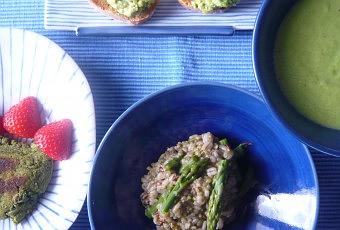 Cette fois, c'était totalement imprévu. Je me suis retrouvée avec quelques fines asperges, une courgette, un demi-concombre. Réfléchissant à une salade de céréales et asperges, je tombe sur une recette toute verte de la délicieuse blogueuse Pascale Weeks : du quinoa vert aux asperges. Il n'en fallut pas davantage pour me donner envie d'un menu vert car j'aime ce type de contrainte amusante qui permet souvent de sortir de ses habitudes.