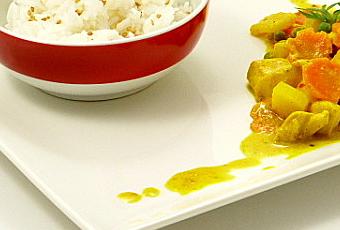 Les ingrédients : 300 gr de blancs de volaille, 1 oignon, 1 carotte, 1/2 ananas, 50 cl de bouillon de volaille, 20 cl de lait de coco, 10 cl de crème liquide, curry, curcuma, gingembre frais, riz basmati, sésame grillé.