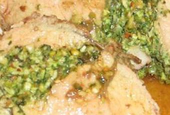 Préparer la farce en mixant en même temps du persil, du basilic, de l'ail, de l'échalote, des noisettes et des amandes. Saler, poivrer et ajouter de l'huile d'olive afin d'obtenir une jolie pâte.