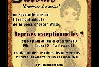 Le Kalinka revisite la très célèbre pièce « Salomé ou l’Impasse des Vertus ». Avec une mise en scène décalée où danse, théâtre, chanson et cirque dessinent un cabaret des années folles, nous découvrons une Salomé pleine de sensualité et de mystères… Ce spectacle musical joue les prolongations après le succès rencontré cet automne.