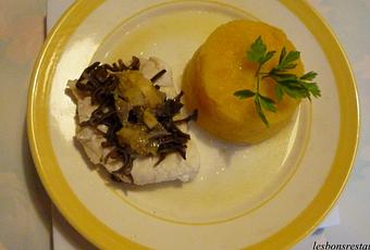 Vous servirez le filet de julienne sur une assiette avec un peu de champignons noirs par-dessus.