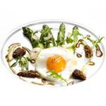 - Placez sur chaque assiette des petites taches de crème d’asperges, ajoutez les têtes rôties, l’œuf au plat, un peu de salade de roquette assaisonnée (huile d’olive, sel et poivre), quelques copeaux de parmesan et le jus de cuisson aux morilles.