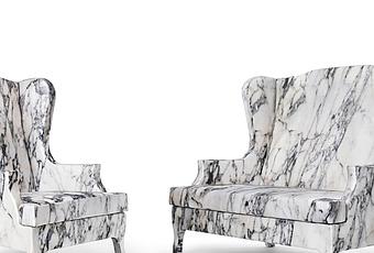 « Louis XV goes to Sparta » est un ensemble composé d’un fauteuil et d’un canapé conçu par Tal Lancman & Maurizio Galante pour Cerruti Baleri. Vu de loin, on jurerait que l’ensemble est gravé dans le marbre. C’est évidemment une illusion, la collection réalisée en bois est recouverte de housses en tissu imprimé numériquement à partir de photographies du célèbre marbre de Carrare. Le résultat offre une synthèse entre un style – le style Louis XV – une plastique – froide et austère et un confort – le confort moderne.