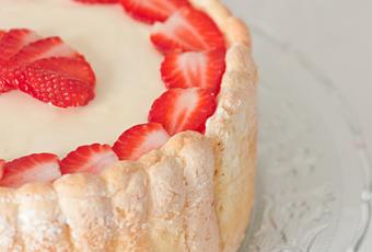 Poser un nouveau disque découper à 16 cm, imbiber et une autre couche de bavarois.Réserver au frais 12h et décorer de fines lamelles de fraises avant de servir.