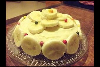 Coupez le gâteau en deux (ou trois tranches s'il est très haut). Garnissez-le de purée de banane. Appuyez légèrement pour bien faire pénétrer les fruits et adhérer.