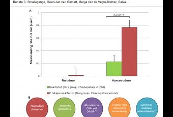 Les chercheurs ont étudié la réponse des moustiques infectés (et non infectés) par le parasite Plasmodium falciparum à l’odeur humain prélevé sur une matrice de tissu et montrent, pour la première fois, que l’infection par P. falciparum provoque des altérations dans les réponses comportementales aux stimuli olfactifs du moustique infecté. Les moustiques infectés ciblent directement le tissu en réponse à l’odeur. Des études précédentes avaient déjà montré que le parasite du paludisme peut modifier le comportement des moustiques de façon à accroître le taux de transmission du paludisme. Par exemple, les moustiques infectés prennent leurs repas de sang à une fréquence plus rapide et en de plus grandes quantités que les moustiques non infectés. Ici, il s’agit de la première démonstration d’un changement de comportement du moustique, causé par une infection à P. falciparum, en réponse à des stimuli olfactifs.