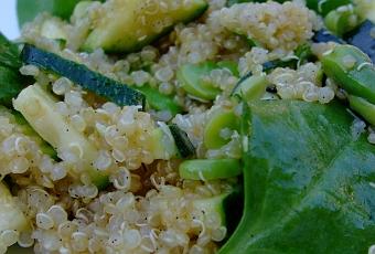 INGRÉDIENTS• 150 g de quinoa • 1 poignée de pousses d’épinards • 1 courgette bien ferme • 500 g de fèves fraîches • 1 gousse de vanille • huile d’olive • poivre et fleur de sel