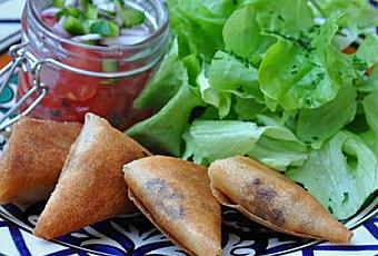 Servir les briouates avec un assortiment de crudités, des petites salades marocaines, salade de tomates à la marocaine,...etc
