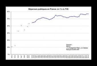Les dépenses de l’État représentent environ 35% du montant total, soit 20,5% du PIB, alors que les dépenses des collectivités locales atteignent 11,5% et les dépenses de la Sécurité sociale 24,6%. Le montant global de le la dépense s’est établi à 1220 milliards d’euros (données OCDE), chiffre en augmentation pour les années 2011 et 2012. Pour compléter ces chiffres, notons que l’Allemagne dont le modèle économique, en particulier en matière de services sociaux, est assez proche du modèle français, arrive à limiter sa dépense publique à 45,7% (soit plus de 10 points inférieur à la France !) ; la moyenne de la zone euro s’élève à 49,2% et la moyenne OCDE se limite à 42,5% (notons que les Etats-Unis réussissent à garder leurs dépenses publiques au niveau très faible de 41,6%).