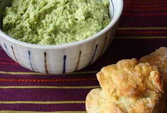 Donc ici, pour l'apéro entre copains, rien de plus simple que de tout mettre dans le robot, "give it a whizz" et se retrouver avec une tartinade qui change. Encore une recette tirée du Elle à table. Super facile à réaliser. J'avais un peu d'appréhension à travailler les petits pois surgelés, mais en fait c'est très bon et très onctueux. Hoummous servi avec des scones au fromage de chèvre. Génial. Hop la recette.
