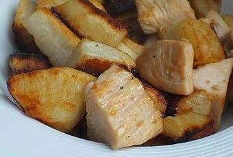 Le persil n'est pas forcément que plat ou frisé, il peut être aussi tubéreux. Il ressemble furieusement à un panais (il fait partie de la même famille des Ombellifères). Son goût est peut-être un chouïa moins sucré, et se situe entre le panais et le céleri rave (toujours de la même famille). Après l'avoir épluché et coupé en "cubes", je l'ai simplement poêlé dans un peu de graisse d'oie (en tout un bon quart d'heure, couvert). Il faut le retourner pour qu'il soit bien doré sur toutes ses faces. J'ai rajouté en fin de cuisson un blanc de poulet déjà cuit.