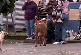 Cette scène se déroule au Brésil. La chèvre, un tantinet agressive fonce sur certains passants pour les faire tomber. Il faudra un certain nombre de victimes avant que cette terroriste des rues soit enfin maîtrisée et attachée.