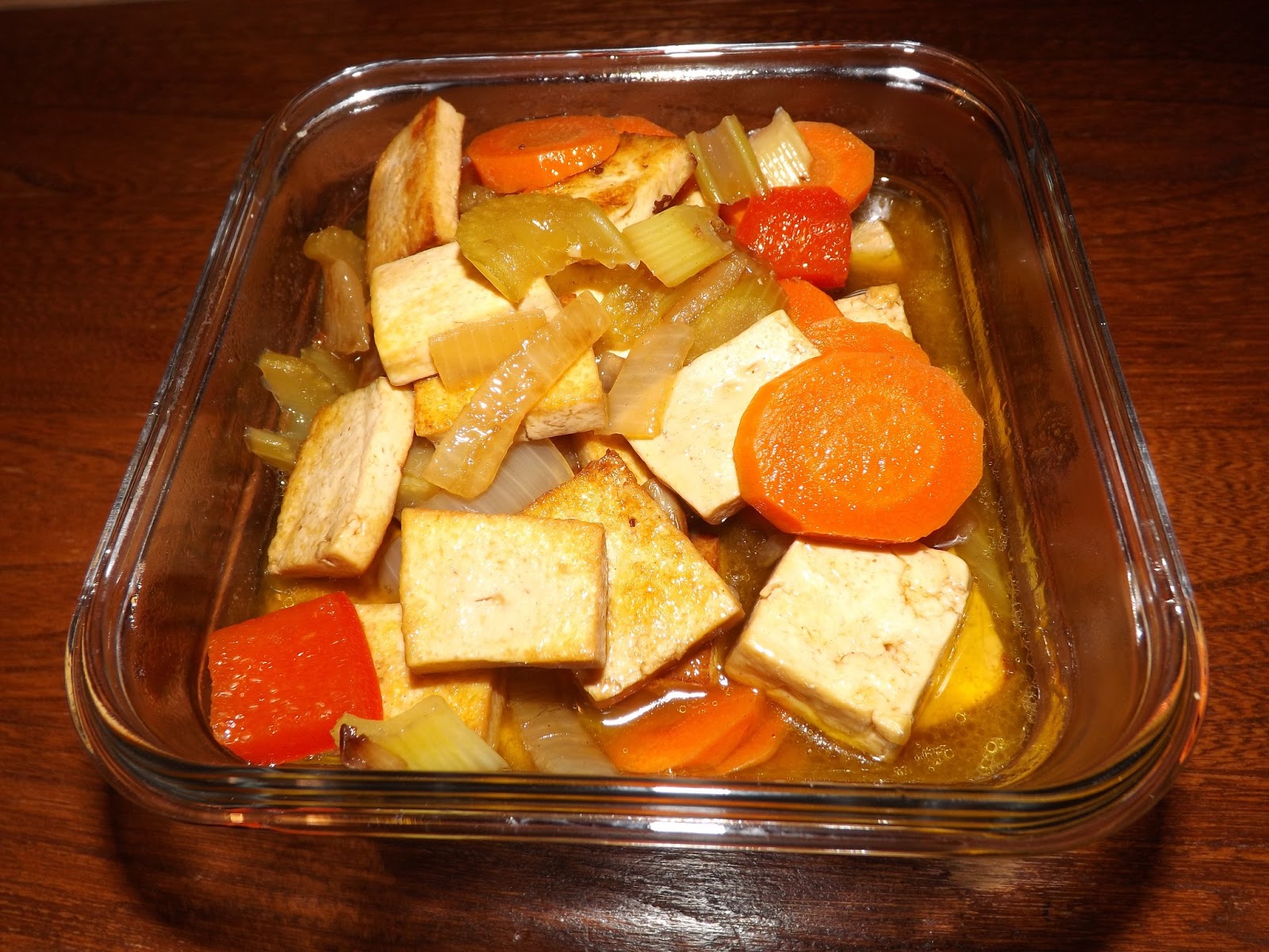 -couper tout vos légumes en tranches ( les carottes en rondelle en biais, les céleri en biais, les poivrons et l'oignon en cube moyen) et le tofu en carré comme sur la photo.