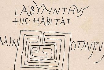 L'être opprobre de sa race [le minotaure] avait grandi et l'ignominieux adultère de la mère éclatait au grand jour avec l'étrangeté du monstre à double forme. Minos décida d'éloigner de sa demeure cet objet de honte et de l'enfermer dans un logis aux détours multiples et sous un toit inaccessible au jour. Dédale, célèbre entre tous par son talent dans l'art de travailler le métal, est l'architecte de cet ouvrage. Il brouille tous les indices et induit en erreur le regard déconcerté par les détours de voies toutes différentes. Tout de même que, dans les campagnes de Phrygie, se joue le Méandre aux eaux limpides ; son cours, hésitant, suit une direction, revient sur lui-même, se porte à la rencontre de ses propres eaux qu'il regarde venir ; et tourné tantôt vers sa source, tantôt vers la haute mer, il finit par fatiguer ses flots, incertains du but à atteindre : ainsi, Dédale multiplie avec d'innombrables routes les risques de s'égarer ; et c'est avec peine qu'il pût lui même revenir jusqu'au seuil, tant la demeure était pleine de pièges. Ovide (Les métamorphoses, livre VIII)