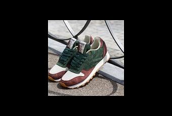 En découle, une paire en daim premium combinant du marron, du vert et du blanc avec un toe box perforé. Une semelle extérieure en gum et des oeillets dorés viennent compléter le tout.