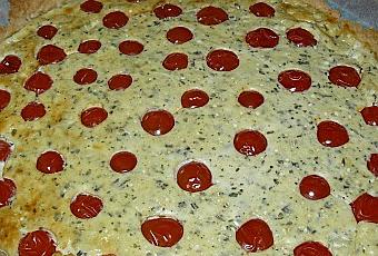 tarte, tomates cerise, ricotta, chèvre frais, oeuf
